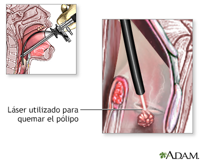 - En la laringoscopia directa, se usa un tubo llamado laringoscopio. El instrumento se coloca en la parte posterior de la garganta. El tubo puede ser flexible o rígido. Este procedimiento le permite a su proveedor ver más profundamente en la garganta y extraer un objeto extraño o una muestra de tejido para una biopsia. Se realiza en un hospital o centro médico bajo anestesia general, lo cual quiere decir que usted estará dormido y sin dolor.